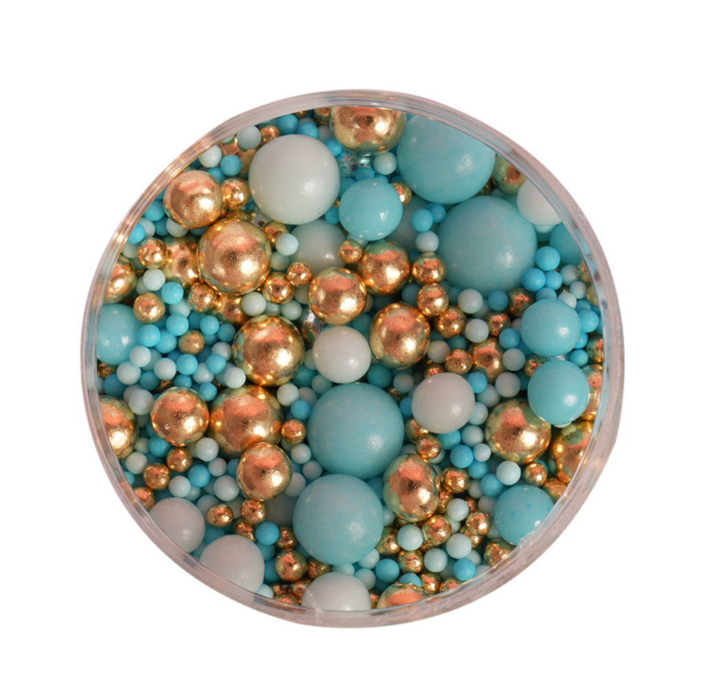 Elevate your creations with Blue Velvet Crunch, a luxe sprinkle blend that brings instant elegance to cakes, cupcakes, cookies and more. This eye-catching mix combines shimmering gold and metallic blue dragees with soft matte aqua and crisp white tones, creating a modern, sophisticated palette that sparkles on any bake.