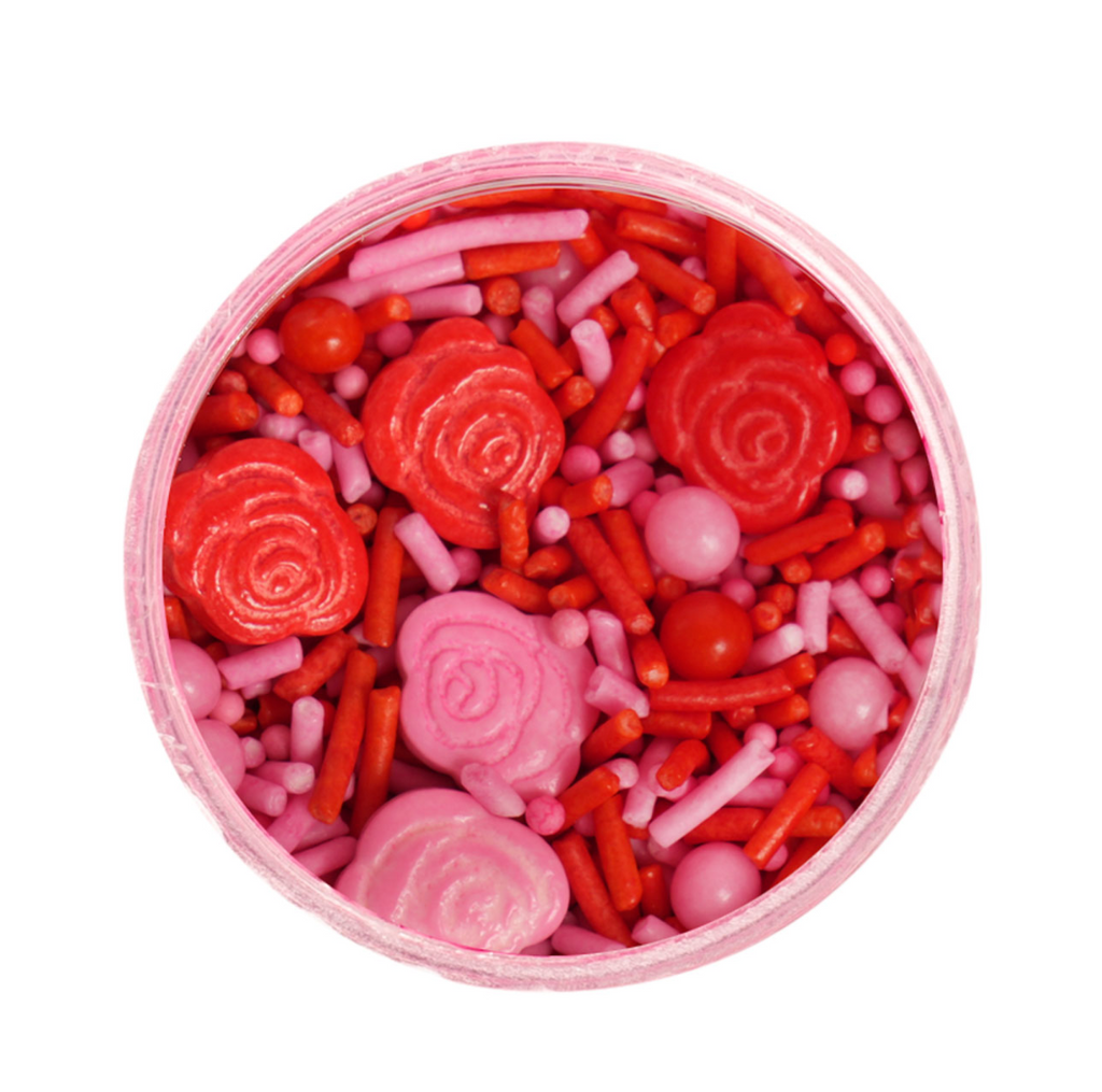 Bring a little romance to your baking with La Vie En Rose — a captivating blend of pink and red jimmies, delicate pearls, and sweet pressed roses. This elegant mix adds instant charm to cupcakes, cookies, cakes, and celebration treats, creating a dreamy finish with every sprinkle.