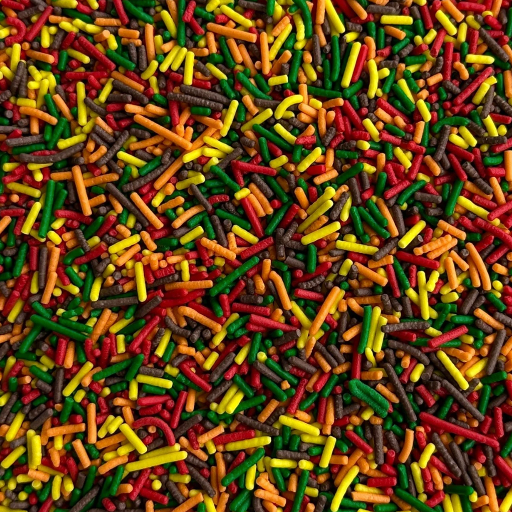 These premium autumn-themed crunchy sprinkles are sought-after skinny sugar strands perfect for embellishing all of your autumn treats. Rich colours combined with Belgian chocolate sprinkles make the perfect cozy harvest sprinkle!